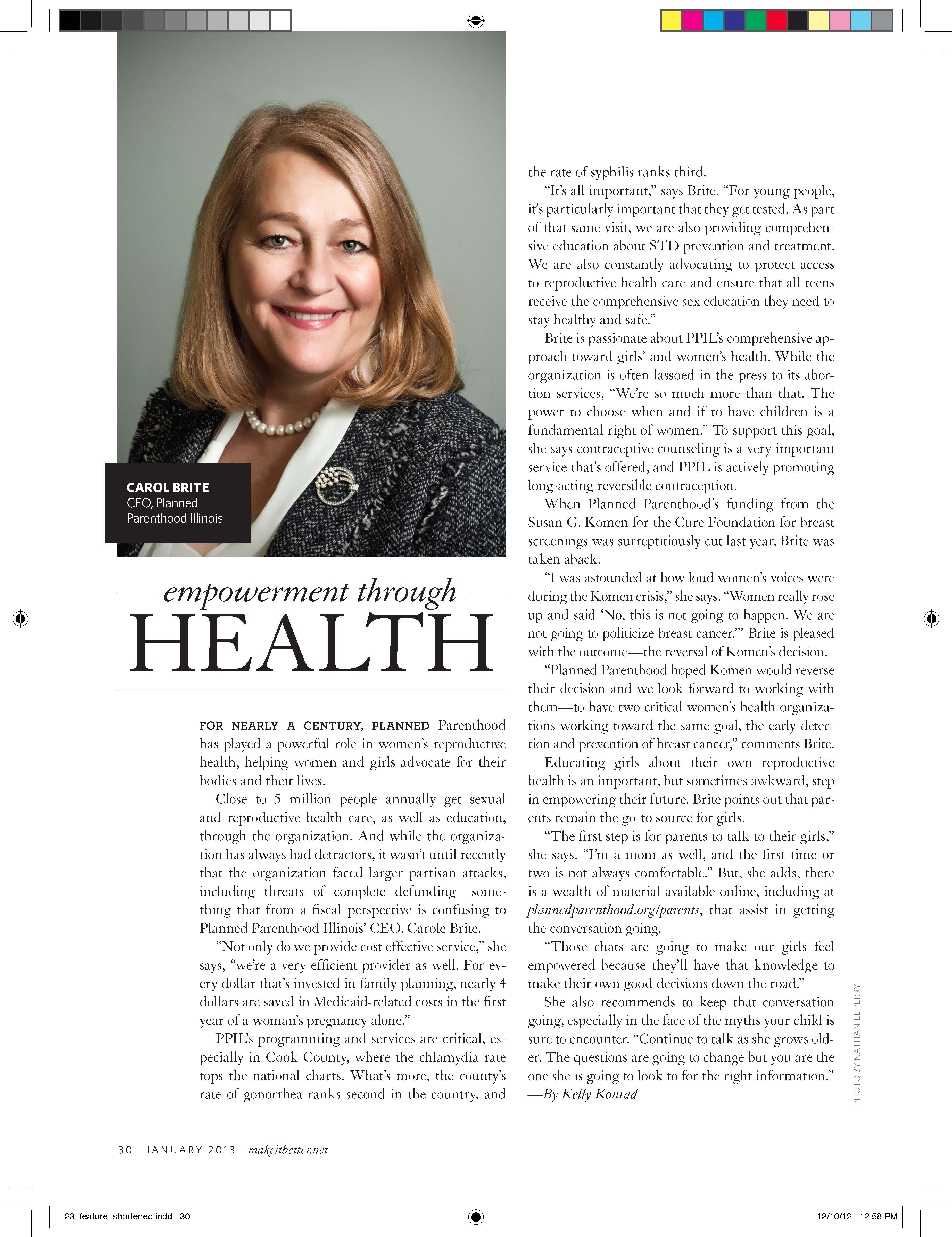 February 20, 2013 Magazine Work. 3693 × 4796 Magazine Feature Carole Brite, Planned Parenthood of Illinois CEO Interview for Empowerment issue Like Loading...